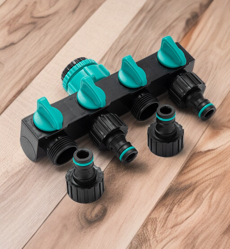 5통 4로 1구 이음매 분수기 수도관, 세차 수도관 스위치 부착, 다양한 분류와 호환, 손쉬운 설치, 내구성 우수, 수도꼭지 커넥터로 효율적인 물 분배 가능.